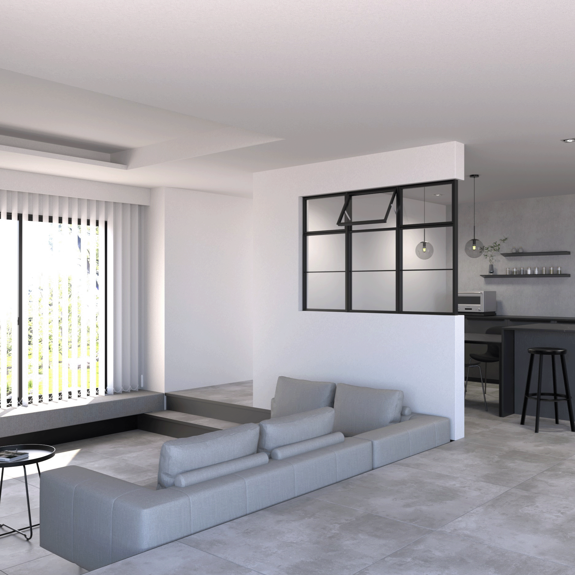 上部だけが開く、換気対応タイプの室内窓。