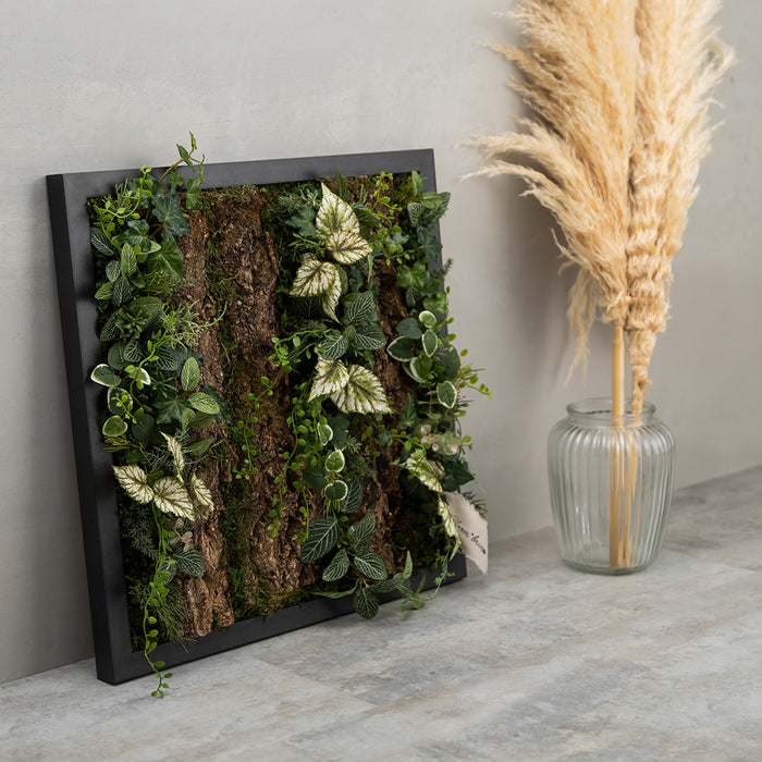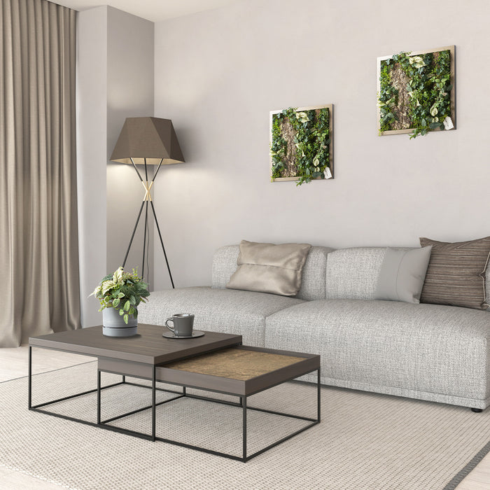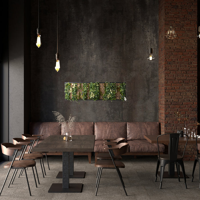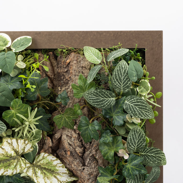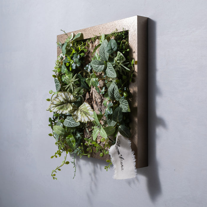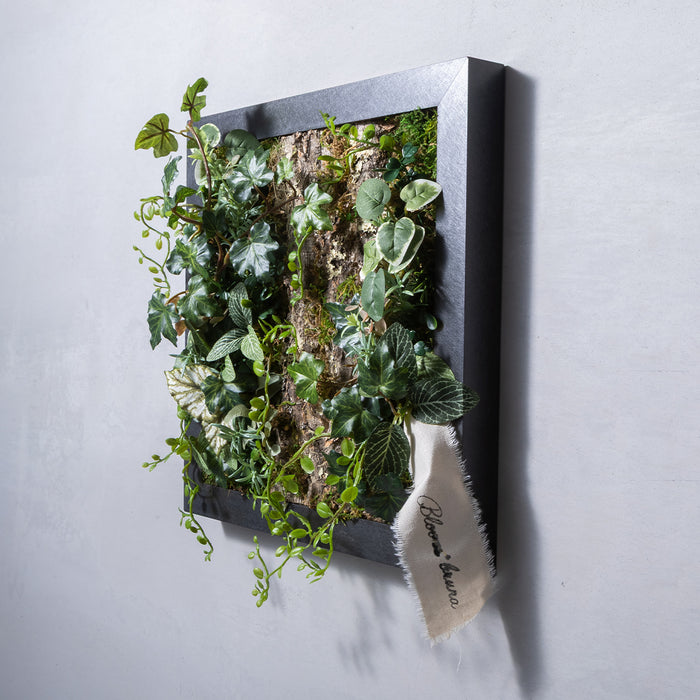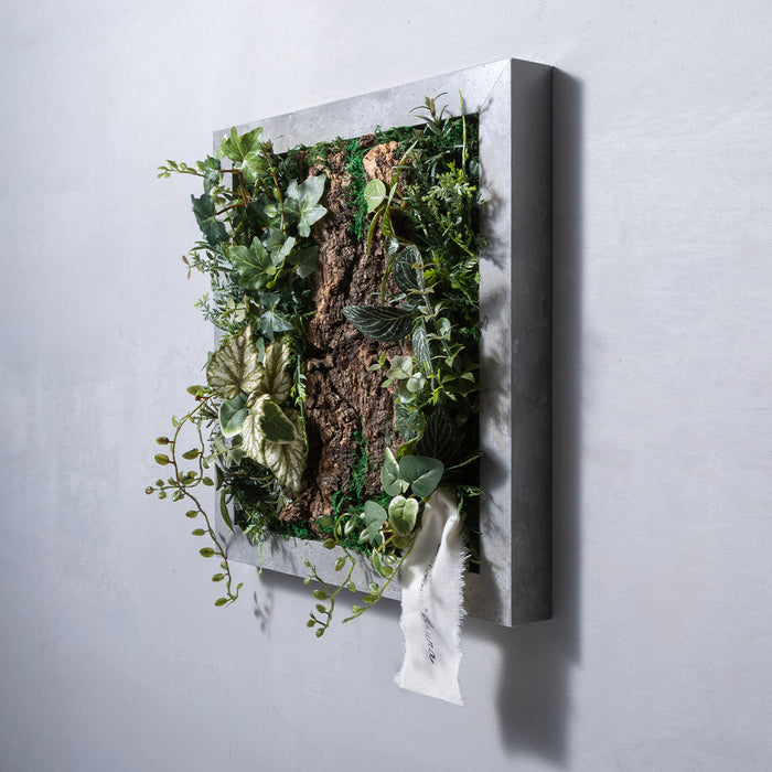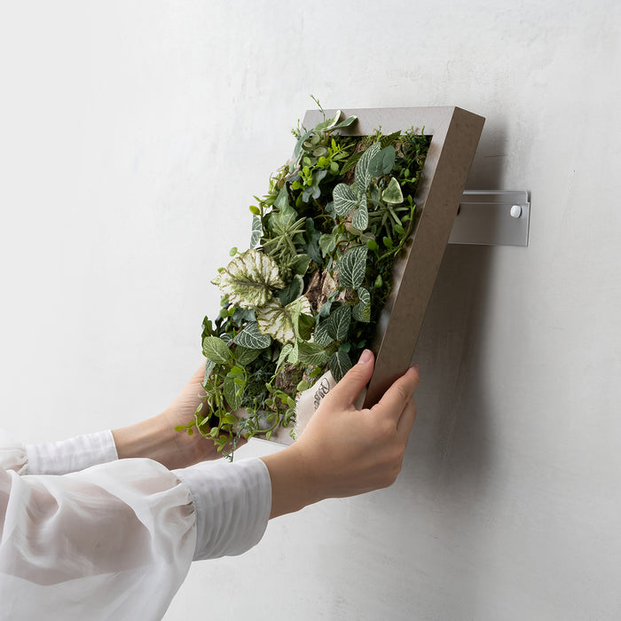モダンでクールな印象と、ふわっと柔らかく光を纏う優しい雰囲気を宿した、アルミ製の美しいフレーム。その美しさを最大限に引き出す、アーティフィシャルグリーンやコルクとの絶妙な組み合わせと、時間の移ろいとともに変化する影の落ち方まで計算された立体的な構成。存在感がありながら、空間に自然と溶け込むインテリアに仕上がっています。