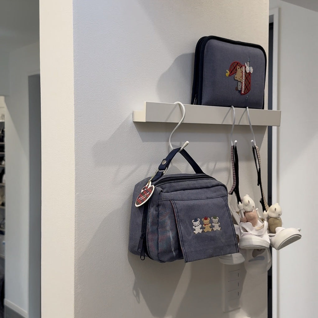 写真やアートを置いて飾る、市販のフックを使って帽子やかばんを掛ける。一つで二役こなす壁面収納です。