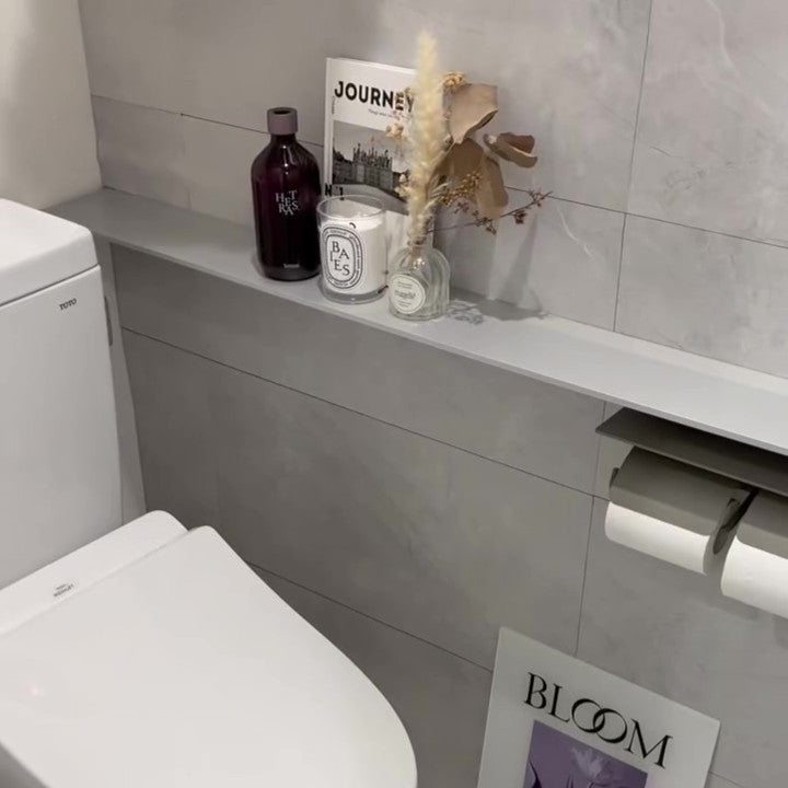 棚受け金具がないスッキリとしたデザインで、圧迫感なく取り付けられるアルミ製ウォールシェルフ。